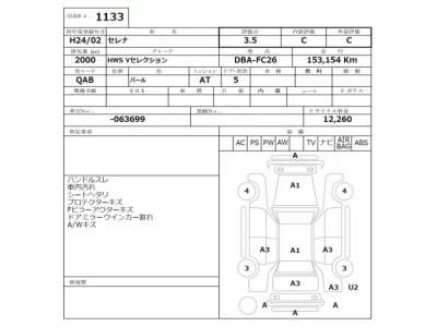 Nissan SERENA Комплектация: HWS V Selection Год: 2012 Объем: 2000 см³ Мощность: 147 л.с. 95 кВт Трансмиссия: Кузов: FC26 Пробег: 153000 км. Оценка: 3.5 Аукцион: NISSAN Osaka Лот: