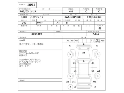 Toyota YARIS Комплектация: Hybrid X Год: 2021 Объем: 1500 см³ Мощность: 91 л.с. 67 кВт Трансмиссия: Кузов: MXPH10 Пробег: 129000 км. Оценка: Аукцион: NISSAN Osaka Лот: 1091