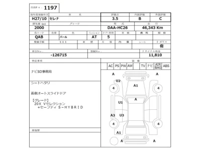 Nissan SERENA Комплектация: Год: 2015 Объем: 2000 см³ Мощность: 147 л.с. 106 кВт Трансмиссия: Кузов: HC26 Пробег: 46000 км. Оценка: 3.5 Аукцион: NISSAN Osaka Лот: 1197