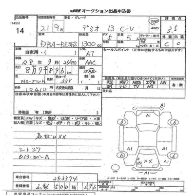 Mazda DEMIO Комплектация: 13C-V Год: 2009 Объем: 1300 см³ Мощность: 90 л.с. 62 кВт Трансмиссия: Кузов: DE3FS Пробег: 90000 км. Оценка: 3.5 Аукцион: JU Yamanashi Лот: