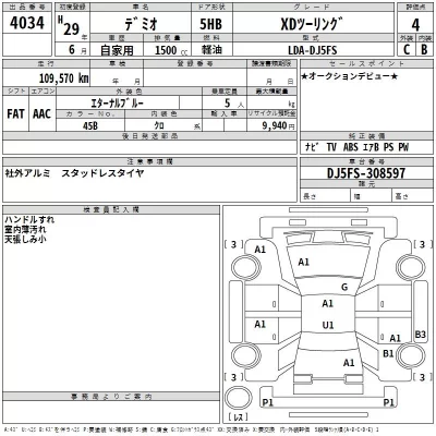 Mazda DEMIO Комплектация: XD Touring Год: 2017 Объем: 1500 см³ Мощность: 105 л.с. 77 кВт Трансмиссия: Кузов: DJ5FS Пробег: 110000 км. Оценка: Аукцион: TAA Hyogo Лот: 4034