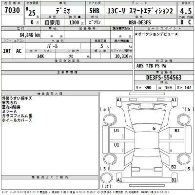 Mazda DEMIO Комплектация: 13C-V Smart Edition 2 Год: 2013 Объем: 1300 см³ Мощность: 90 л.с. 62 кВт Трансмиссия: Кузов: DE3FS Пробег: 65000 км. Оценка: 4.5 Аукцион: TAA Hyogo Лот: