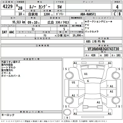 Renault KANGOO Комплектация: Год: 2016 Объем: 1200 см³ Мощность: 115 л.с. 84 кВт Трансмиссия: Кузов: KWH5F1 Пробег: 96000 км. Оценка: Аукцион: TAA Hyogo Лот: 4229 Статус: