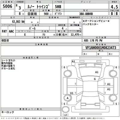 Renault TWINGO Комплектация: Год: 2021 Объем: 900 см³ Мощность: 90 л.с. 68 кВт Трансмиссия: Кузов: AHH4B Пробег: 64000 км. Оценка: 4.5 Аукцион: TAA Hyogo Лот: 5006
