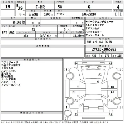 Toyota C-HR Комплектация: Год: 2017 Объем: 1800 см³ Мощность: 98 л.с. 53 кВт Трансмиссия: Кузов: ZYX10 Пробег: 87000 км. Оценка: Аукцион: TAA Hiroshima Лот: Статус: продано