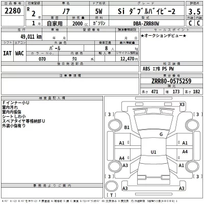 Toyota NOAH Комплектация: Si ダ Blue バイビ-2 Год: 2020 Объем: 2000 см³ Мощность: 152 л.с. Трансмиссия: Кузов: ZRR80W Пробег: 49000 км. Оценка: 3.5 Аукцион: TAA Hiroshima Лот: 2280