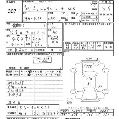 Nissan MARCH Комплектация: 12X Год: 2012 Объем: 1200 см³ Мощность: 79 л.с. 58 кВт Трансмиссия: Кузов: K13 Пробег: 48000 км. Оценка: 3.5 Аукцион: JU Ishikawa Лот: