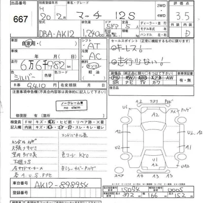 Nissan MARCH Комплектация: 12S Год: 2008 Объем: 1240 см³ Мощность: 108 л.с. 48 кВт Трансмиссия: Кузов: AK12 Пробег: 67000 км. Оценка: 3.5 Аукцион: JU Ishikawa Лот: