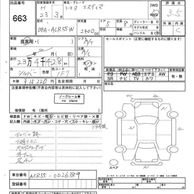 Toyota ESTIMA Комплектация: 4WD Год: 2011 Объем: 2400 см³ Мощность: 170 л.с. 110 кВт Трансмиссия: FULLTIME4WD Кузов: ACR55W Пробег: 234000 км. Оценка: 3.5 Аукцион: JU Ishikawa