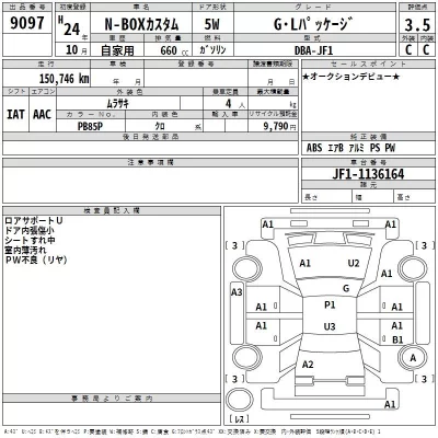 Honda N BOX Комплектация: G L Package Год: 2012 Объем: 660 см³ Мощность: 58 л.с. 43 кВт Трансмиссия: Кузов: JF1 Пробег: 151000 км. Оценка: 3.5 Аукцион: TAA Kanto Лот: