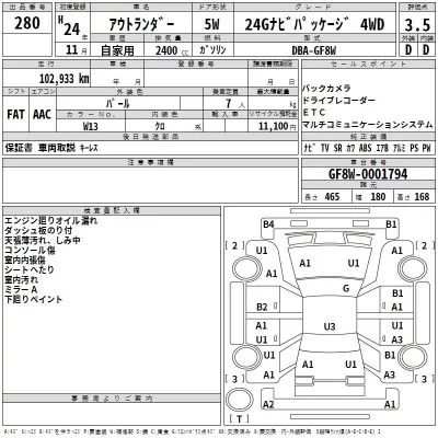 Mitsubishi OUTLANDER Комплектация: 24G Navi Package 4WD Год: 2012 Объем: 2400 см³ Мощность: 169 л.с. 123 кВт Трансмиссия: FULLTIME4WD Кузов: GF8W Пробег: 103000 км. Оценка: 3.5 Аукцион: TAA Kanto