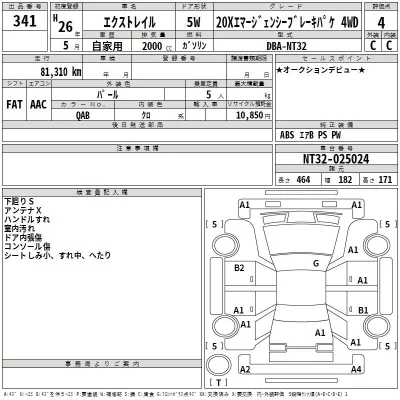 Nissan X-TRAIL Комплектация: 20X Emergency -ブレ- 4WD Год: 2014 Объем: 2000 см³ Мощность: 137 л.с. 101 кВт Трансмиссия: Кузов: NT32 Пробег: 81000 км. Оценка: Аукцион: TAA Kanto Лот: 341