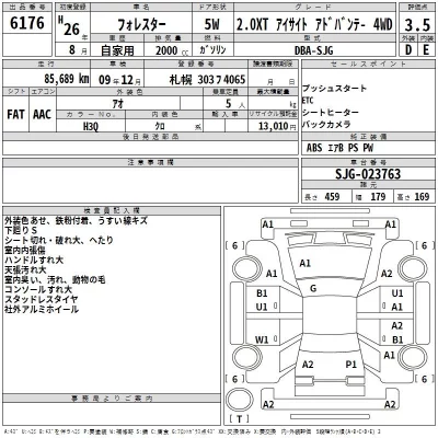 Subaru FORESTER Комплектация: 2.0XT Eyesite アドバ 4WD Год: 2014 Объем: 2000 см³ Мощность: 280 л.с. 108 кВт Трансмиссия: FULLTIME4WD Кузов: SJG Пробег: 86000 км. Оценка: 3.5 Аукцион: TAA Hokkaido