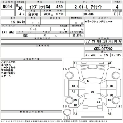 Subaru IMPREZA G4 Комплектация: 2.0i-L Eyesite Год: 2018 Объем: 2000 см³ Мощность: 154 л.с. Трансмиссия: Кузов: GK6 Пробег: 122000 км. Оценка: Аукцион: TAA Chubu Лот: 8014 Статус: