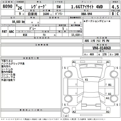Subaru LEVORG Комплектация: 1.6GT Eyesite 4WD Год: 2014 Объем: 1600 см³ Мощность: 170 л.с. 125 кВт Трансмиссия: FULLTIME4WD Кузов: VM4 Пробег: 85000 км. Оценка: 4.5 Аукцион: TAA Chubu