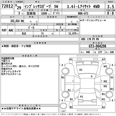 Subaru IMPREZA Комплектация: 1.6i-L Eyesite 4WD Год: 2017 Объем: 1600 см³ Мощность: 116 л.с. Трансмиссия: Кузов: GT3 Пробег: 103000 км. Оценка: 3.5 Аукцион: TAA Chubu Лот: 72012