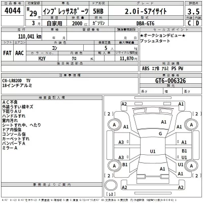 Subaru IMPREZA Комплектация: 2.0i-S Eyesite Год: 2017 Объем: 2000 см³ Мощность: 154 л.с. 113 кВт Трансмиссия: Кузов: GT6 Пробег: 110000 км. Оценка: 3.5 Аукцион: TAA Kanto Лот: