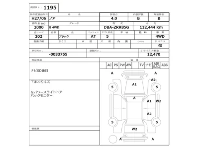 Toyota Noah Комплектация: G 4WD Год: 2015 Объем: 2000 см³ Мощность: 152 л.с. 112 кВт Трансмиссия: FULLTIME4WD Кузов: ZRR85G Пробег: 112000 км. Оценка: Аукцион: NISSAN Osaka Лот: