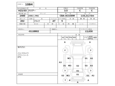 Toyota Harrier Комплектация: 240G L-PKG Год: 2011 Объем: 2400 см³ Мощность: 160 л.с. 118 кВт Трансмиссия: Кузов: ACU30W Пробег: 119000 км. Оценка: 3.5 Аукцион: NISSAN Osaka Лот: