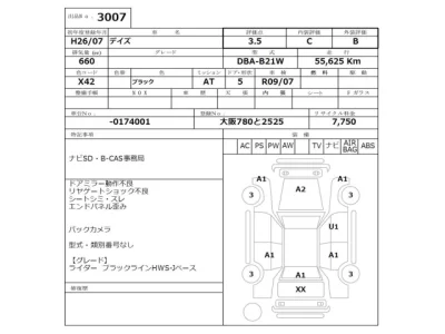 Nissan DAYZ Комплектация: Год: 2014 Объем: 660 см³ Мощность: 49 л.с. 36 кВт Трансмиссия: FF,FULLTIME4WD Кузов: B21W Пробег: 55000 км. Оценка: 3.5 Аукцион: NISSAN Osaka Лот: