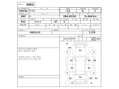 Nissan DAYZ Комплектация: Год: 2017 Объем: 660 см³ Мощность: 49 л.с. 36 кВт Трансмиссия: FF,FULLTIME4WD Кузов: B21W Пробег: 31000 км. Оценка: 3.5 Аукцион: NISSAN Osaka Лот: