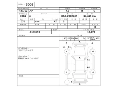 Toyota Noah Комплектация: Год: 2015 Объем: 2000 см³ Мощность: 152 л.с. 112 кВт Трансмиссия: Кузов: ZRR80W Пробег: 34000 км. Оценка: Аукцион: NISSAN Osaka Лот: 3003 Статус: