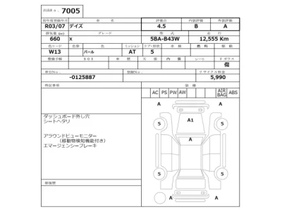 Nissan DAYZ Комплектация: Год: 2021 Объем: 660 см³ Мощность: 52 л.с. 38 кВт Трансмиссия: Кузов: B43W Пробег: 12000 км. Оценка: 4.5 Аукцион: NISSAN Osaka Лот: 7005