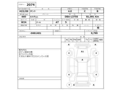Daihatsu TANTO Комплектация: Custom L Год: 2011 Объем: 660 см³ Мощность: 52 л.с. Трансмиссия: Кузов: L375S Пробег: 81000 км. Оценка: Аукцион: NISSAN Osaka Лот: 2074 Статус: