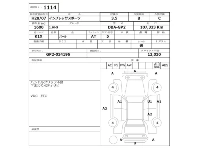 Subaru IMPREZA Комплектация: 1.6i-S Год: 2016 Объем: 1600 см³ Мощность: 116 л.с. Трансмиссия: Кузов: GP2 Пробег: 107000 км. Оценка: 3.5 Аукцион: NISSAN Osaka Лот: 1114