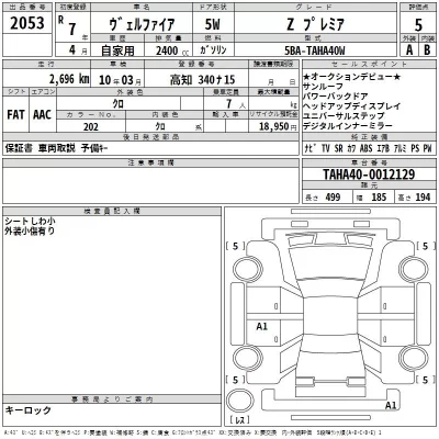 Toyota Vellfire Комплектация: Z プレミア Год: 2025 Объем: 2400 см³ Мощность: 279 л.с. 205 кВт Трансмиссия: Кузов: TAHA40W Пробег: 3000 км. Оценка: Аукцион: TAA Shikoku Лот: 2053