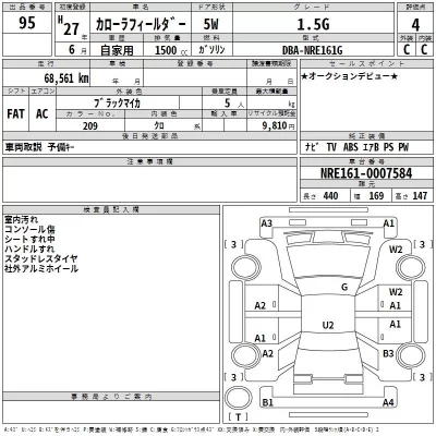 Toyota Corolla Fielder Комплектация: 1.5G Год: 2015 Объем: 1500 см³ Мощность: 109 л.с. 54 кВт Трансмиссия: Кузов: NRE161G Пробег: 69000 км. Оценка: Аукцион: TAA Shikoku Лот: Статус: