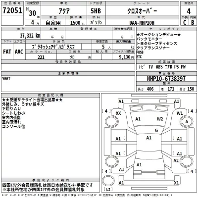Toyota Aqua Комплектация: Crossover Год: 2018 Объем: 1500 см³ Мощность: 74 л.с. 54 кВт Трансмиссия: Кузов: NHP10H Пробег: 37000 км. Оценка: Аукцион: TAA Shikoku Лот: 72051