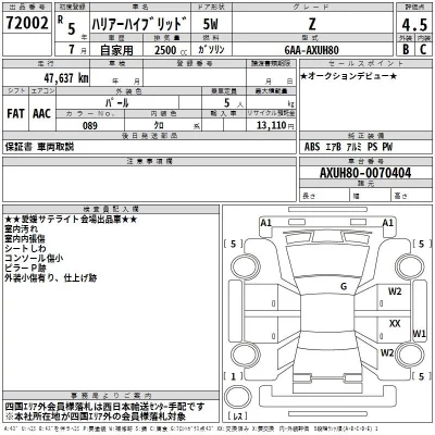 Toyota Harrier Комплектация: Год: 2023 Объем: 2500 см³ Мощность: 178 л.с. 88 кВт Трансмиссия: Кузов: AXUH80 Пробег: 48000 км. Оценка: 4.5 Аукцион: TAA Shikoku Лот: 72002