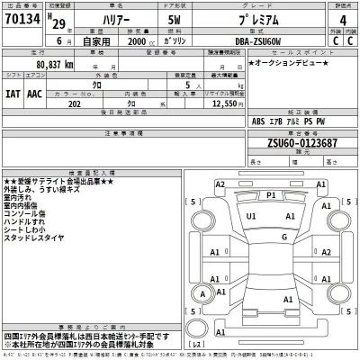 Toyota Harrier Комплектация: PREMIUM Год: 2017 Объем: 2000 см³ Мощность: 151 л.с. Трансмиссия: Кузов: ZSU60W Пробег: 81000 км. Оценка: Аукцион: TAA Shikoku Лот: 70134 Статус: