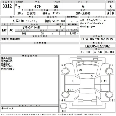 Daihatsu TAFT Комплектация: Год: 2025 Объем: 660 см³ Мощность: 52 л.с. 38 кВт Трансмиссия: Кузов: LA900S Пробег: 5000 км. Оценка: Аукцион: TAA Yokohama Лот: 3312 Статус: