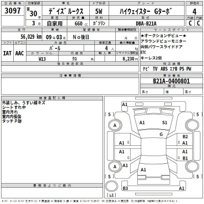 Nissan DAYZ ROOX Комплектация: Highway Star - G Turbo Год: 2018 Объем: 660 см³ Мощность: 49 л.с. 36 кВт Трансмиссия: FF,FULLTIME4WD Кузов: B21A Пробег: 56000 км. Оценка: Аукцион: TAA Hiroshima Лот: