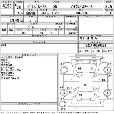 Nissan DAYZ ROOX Комплектация: Highway Star - X Год: 2014 Объем: 660 см³ Мощность: 49 л.с. 36 кВт Трансмиссия: FF,FULLTIME4WD Кузов: B21A Пробег: 171000 км. Оценка: 3.5 Аукцион: TAA Hiroshima
