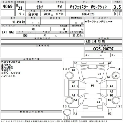 Nissan SERENA Комплектация: Highway Star - V Selection Год: 2009 Объем: 2000 см³ Мощность: 137 л.с. 95 кВт Трансмиссия: Кузов: CC25 Пробег: 98000 км. Оценка: 3.5 Аукцион: TAA Hiroshima Лот: